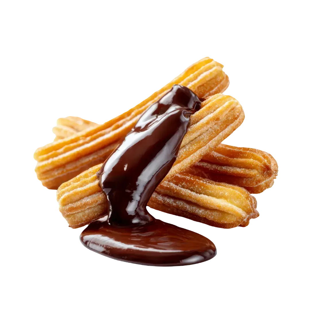 Churros caldi e dorati, croccanti fuori e morbidi dentro, serviti con una crema al cioccolato densa in cui intingerli morso dopo morso.
