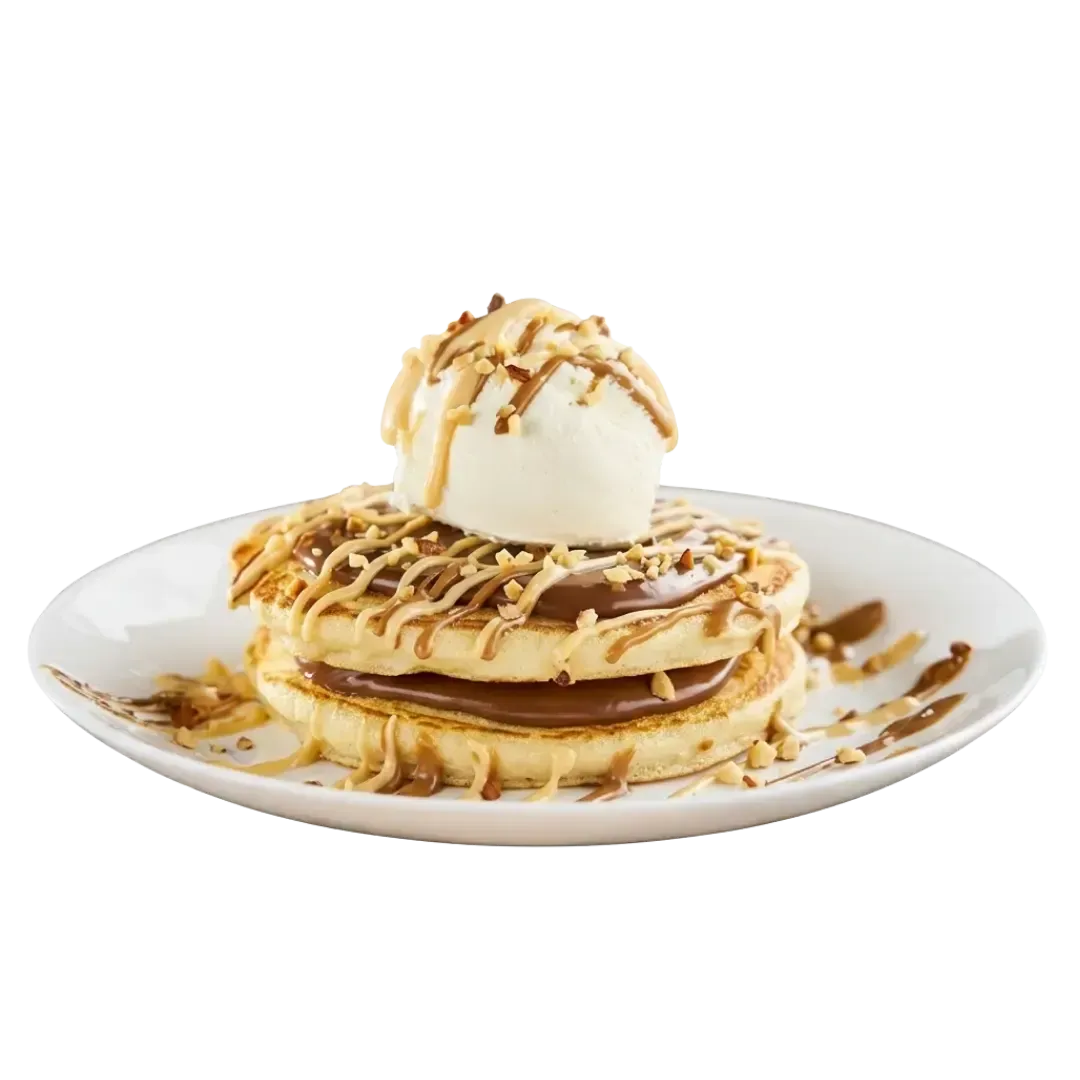Pancake soffice e caldo, farcito con Nutella cremosa e servito con cremosa pallina di gelato. Un dolce goloso per grandi e piccini
